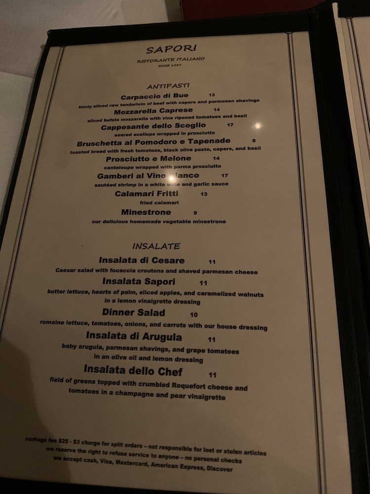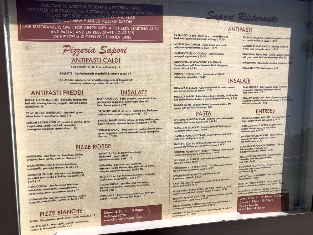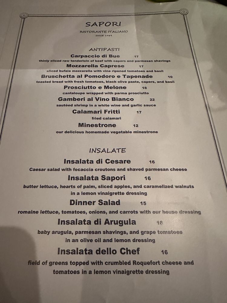 Introducing the menu at Sapori Ristorante, located in Newport Beach, California, where the authentic Italian flavors shine through. Start off with Antipasti options like Carpaccio Di Bue or Mozzarella Caprese before moving on to refreshing salads like Insalata Sapori. For the main course, indulge in dishes like Salsiccia Ai Ferri Alle Erbe or Suprema Di Pollo Piccata. Customers rave about the impeccable service and inviting ambiance, transporting them to the heart of Italy. The wood-burning oven pizzas and pasta dishes are a highlight, creating a true Italian dining experience. From the warm and welcoming staff to the delicious food made with fresh ingredients, Sapori Ristorante is a hidden gem for those craving authentic Italian cuisine.